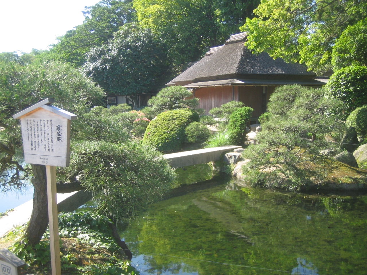 岡山後楽園の廉池軒です。この廉池軒は、戦災をまぬがれた数少ない建物の一つで、池に架かる石橋や対岸の小島なども、往時の姿を今に伝えています。この建物からは、沢の池越しに見える松林や曲水と池の段差なで、起伏に富んだ景観です、ぜひ、