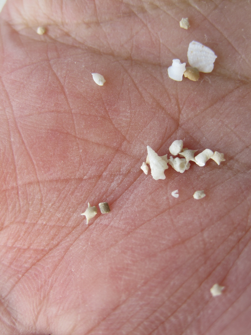 手のひらを砂に押し付ければ、いくつかの星砂がみられます。