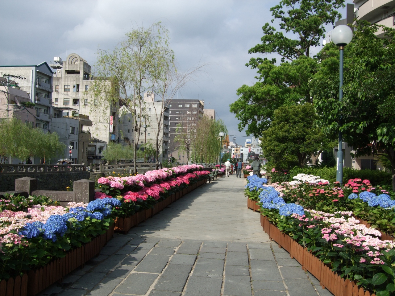 長崎の花はあじさいです。この時期、あじさいが見ごろを迎えていましたが、一番豪華なあじさいはこの眼鏡橋付近。このあじさいはどこか別の場所で育てられているのですが、この時期なるとここに植え替えられて、観光局を楽しませてくれます。雨の多い時期ではありますが、この日はちゃんと晴れてくれました。