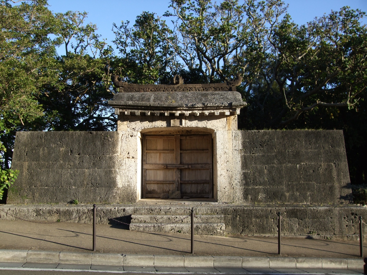 守礼門に向かうすぐ手前にある石門。道路沿いに何気なくあるので、知らないと見過ごしてしまうかもしれません。しかし、これも琉球王国のグスクおよび関連遺跡群という世界遺産のひとつ。朝は正面から日が当たるので、こんなにきれいです。国王が首里城を出るときは、この門に無事を祈った拝所なのだそうです。首里城に入る前に見るのが道順です。