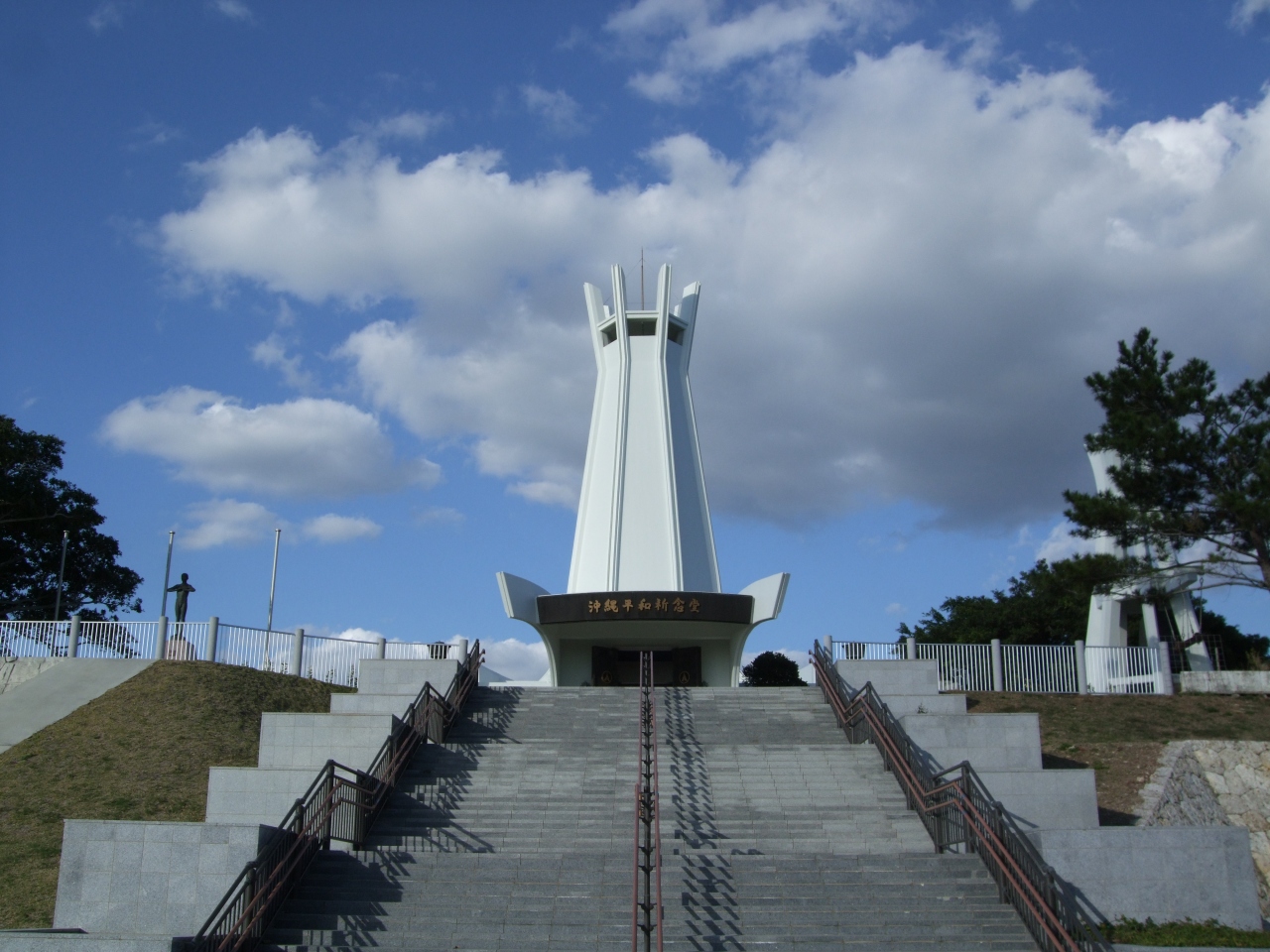 沖縄戦の組織的な戦闘が終結したと言われるマブニの丘を正面に眺める高台に立つ祈念堂です。中は、吹き抜けの広い空間があって、正面には大仏が鎮座ましましています。周囲には沖縄にちなむ絵画の展示。地下室には全国の県の石を集めて、平和を祈る一覧展示もありました。ただ、何よりも、この地にあって、この白い建て物そのものが平和を祈る気持ちを雄弁に語っているようでした。