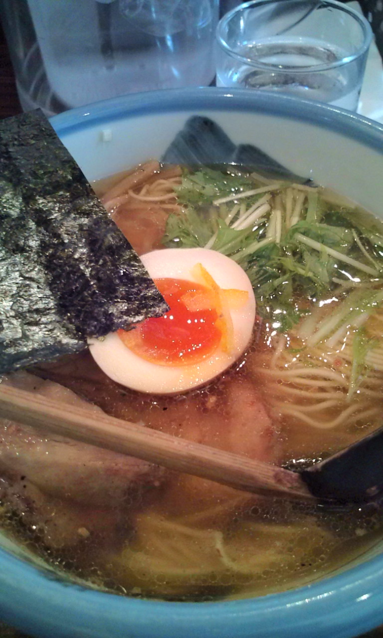 美味しいラーメン店がある、と原宿駅から歩いていきました。真夏の猛暑で、ホントに食べるの?と迷いつつも、清潔そうな店構えにホッとして入るとつけ麺も冷やしもメニューにありました。でも初回ですからゆず塩ラーメン。スープも細麺も私好み。ご馳走様でした。
