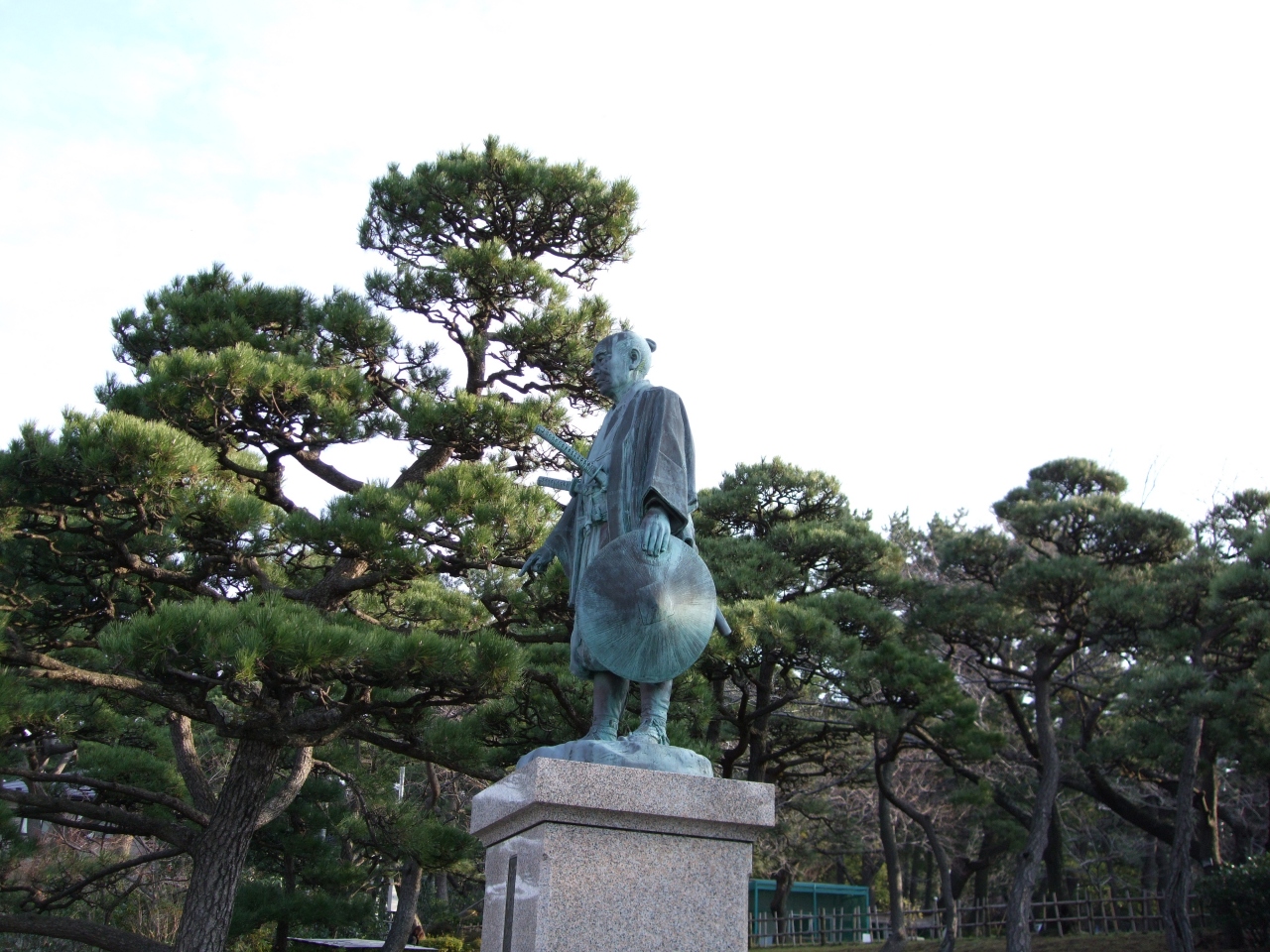 日和山公園は酒田市街の外れ。最上川の河口近くにあります。市街からは歩いて30分くらいあるでしょうか。この像は貝原益軒。日本海側を回る廻船航路を開きました。酒田は最上川の産物流通とこの北前船のお陰で、繁栄を極めたので、河村瑞賢は酒田の恩人ということでしょう。目当てはここに設置してあるという北前船だったのですが、今はないようです。残念。