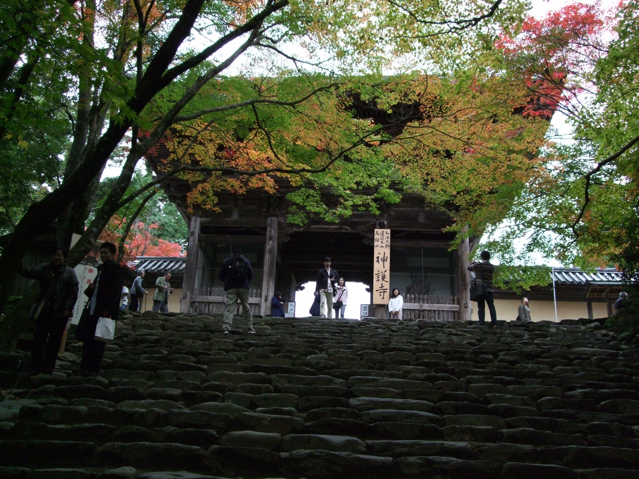 長い長い神護寺の石段を登りつめるとこの山門に到着します。まだ青い感じのもみじの色でしたが、光を透かして見る緑がとてもきれいでした。神護寺はこの山門を入って、境内は広く、一番奥にはかわらけ投げの場所もあります。ほかに紅葉の見所は本堂から、石段下を眺めるスポット。石段の両側にもみじがかぶさる感じがすばらしいです。