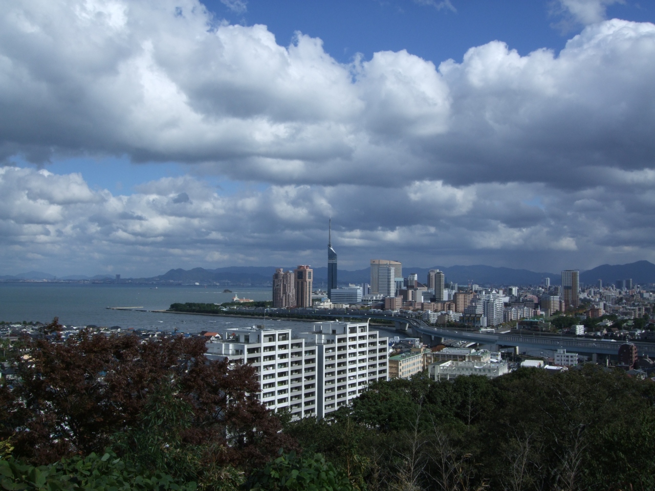 福岡では単に「あたご神社」というだけです。地下鉄の室見駅から歩いて、20分くらい。そう高い山ではないのですが、それなりにふうふう言いながら登るとこの境内の展望所に到着します。福岡タワーに福岡ドーム、ホテルはこのあたりのシンボルですが、ドーム・ホテルはダイエーの遺産であることを思うと、中内さんは福岡の恩人ですね。ここの絶景は福岡で一番のお勧めです。