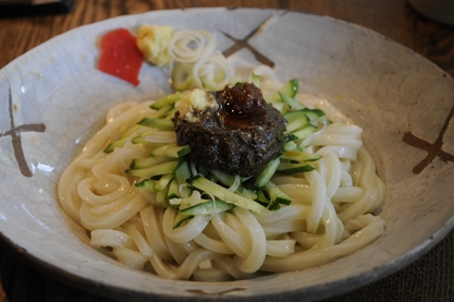 うどん風の太い麺の上に乗っているのは、キュウリの細切りと肉味噌。+ネギやショウガなどの薬味。