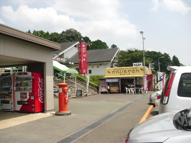 多くの車でにぎわう道の駅です。駐車場に沿って多くの屋台店が並び、団子やたこ焼きなどを売っていました。中には、「からあげ職人」といった専門性の高い店もありました。熊本の物産をたくさん集めていて、見ているだけで目移りしました。