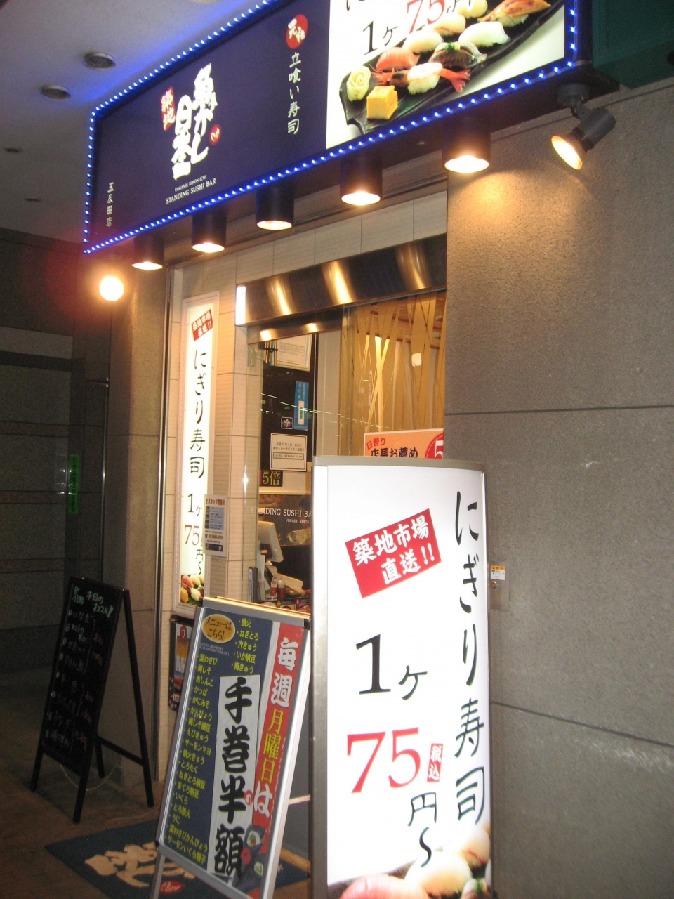 五反田駅からすぐの立ち食いすしのお店です。立ち食いですが、注文に合わせて板前さんがその場で握ってくれるので、出来だてのお寿司を食べることができます。でも値段は回転寿司並。長居して食べるという感じではなく、さくっとつまんでといった感じですが、その分ちょっと食べたいなというときに好都合です。注文は2貫ずつが基本。「まぐろとかんぱち」といった感じです。夕食時は平日でも混んでますが、回転が速いので、いっぱいでも待っていればすぐに食べれます。