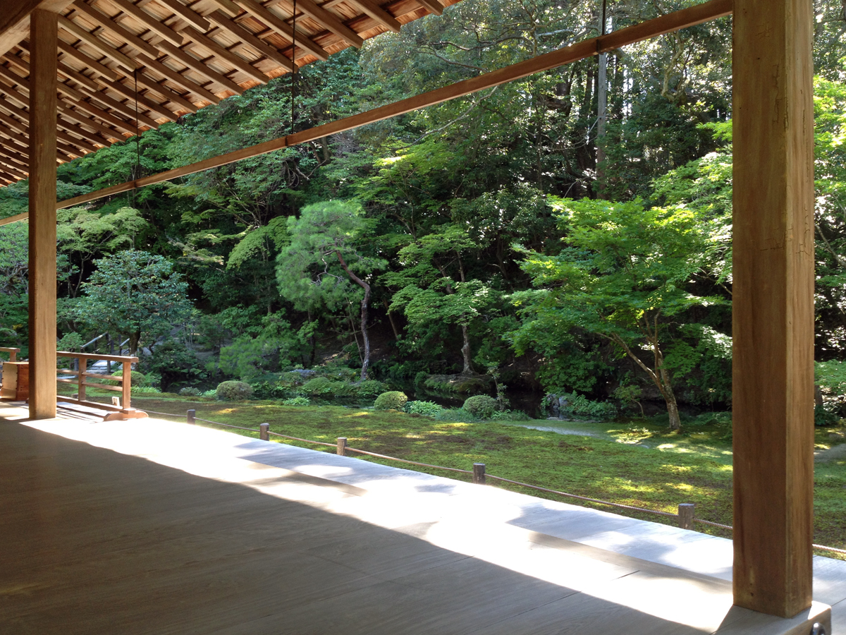 方丈の軒下に座って見ていると、木々の中に配された池の趣が素朴ではあるが見事でした。