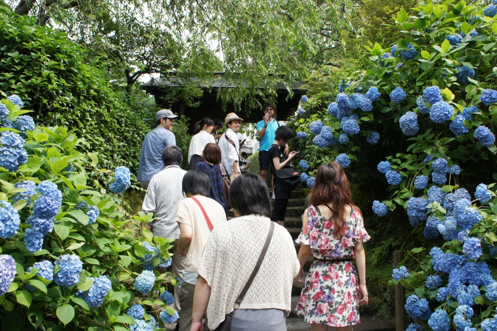 鎌倉にはアジサイ寺と呼ばれる寺がいくつかありますが、アジサイ真っ盛りの梅雨時、そのうちの一つ明月院を訪れました。シーズン中だけに明月院に向かう道路は観光客がゾロゾロ。警備員も出て交通整理してます。総門を入ると、渡月橋風の橋を通るのに行列ができています。方丈に向けて上り坂になっていますが、その左右がとにかくアジサイ、アジサイ、アジサイ。それもほぼ全部といっていいほど青いアジサイです。姫アジサイと呼ばれる種類で日本で古くから種だそうです。休日で人が多すぎ、静かにアジサイを味わうという雰囲気ではなかったけど、とってもきれいでした。それと、「協力金」のようなものが必要だけど、方丈では、お茶とお菓子が振る舞われ、丸い窓越しに庭園を眺めることができました。