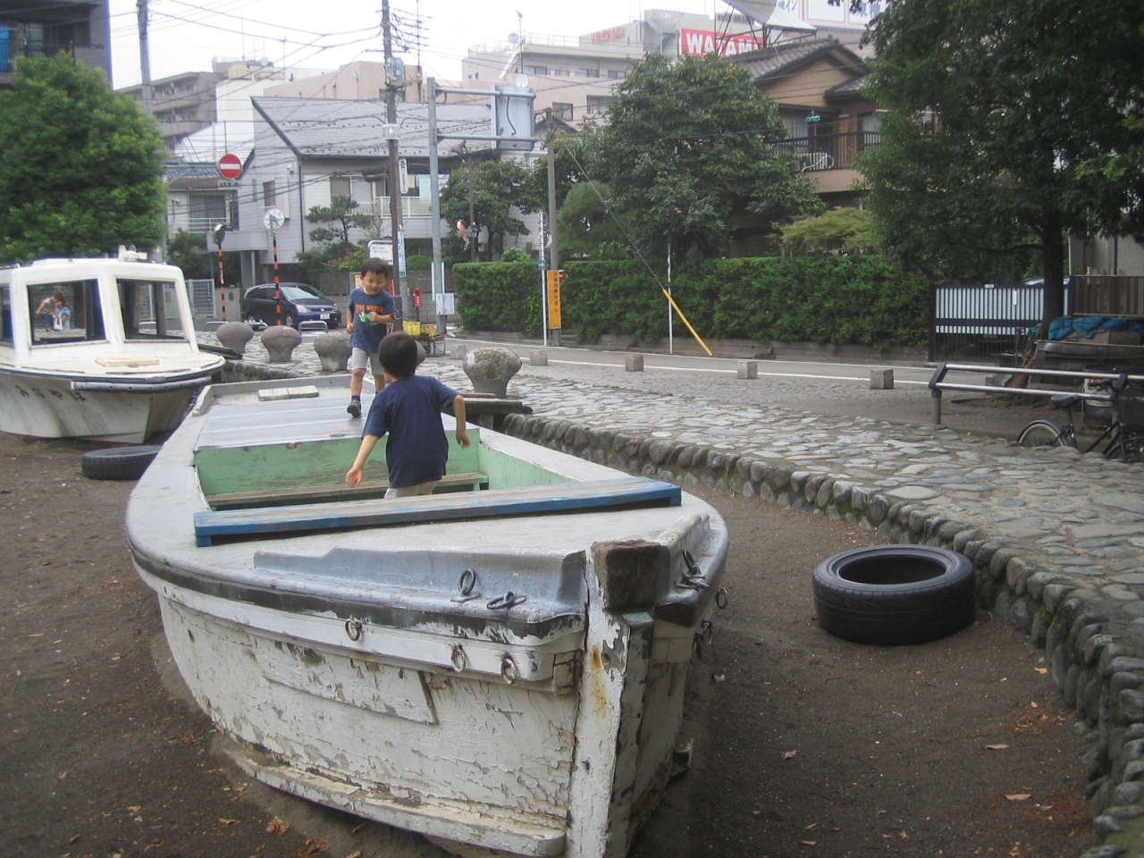 萩中公園 (はぎなかこうえん)には、写真の様な小船が置いてあって、船長気分で運転する事もできますし、また、隠れ家としてもよく使われます。子供たちにとっては、色々な乗り物に乗れますので、ぜひ、一度。行ってみてください。