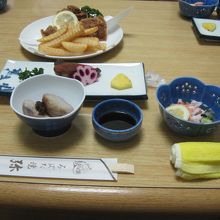 小鉢×2、焼き魚、フライドポテト、鳥の唐揚げ、刺身、焼きおにぎり、ホタテの何だっけ?