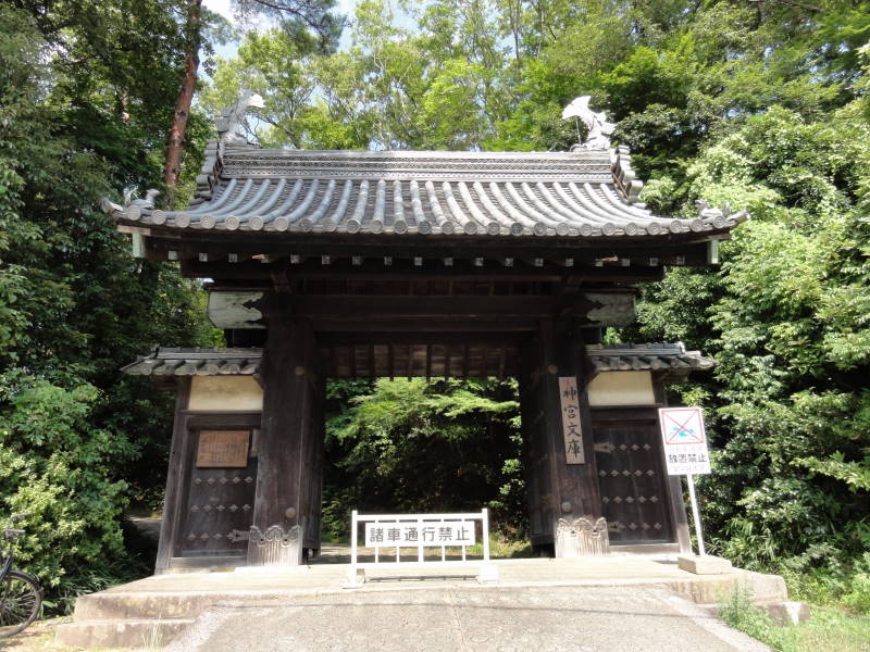 外宮と内宮を結ぶ御幸道路の中間点に道路に面して立っている神宮文庫の門です。江戸時代に御師として活躍した福島みさき太夫の館の門をここに移築したもので、その姿から黒門と呼ばれています。江戸時代には伊勢市内にたくさんあった御師の屋敷も今では皆無に等しくわずかに門が残るだけです。