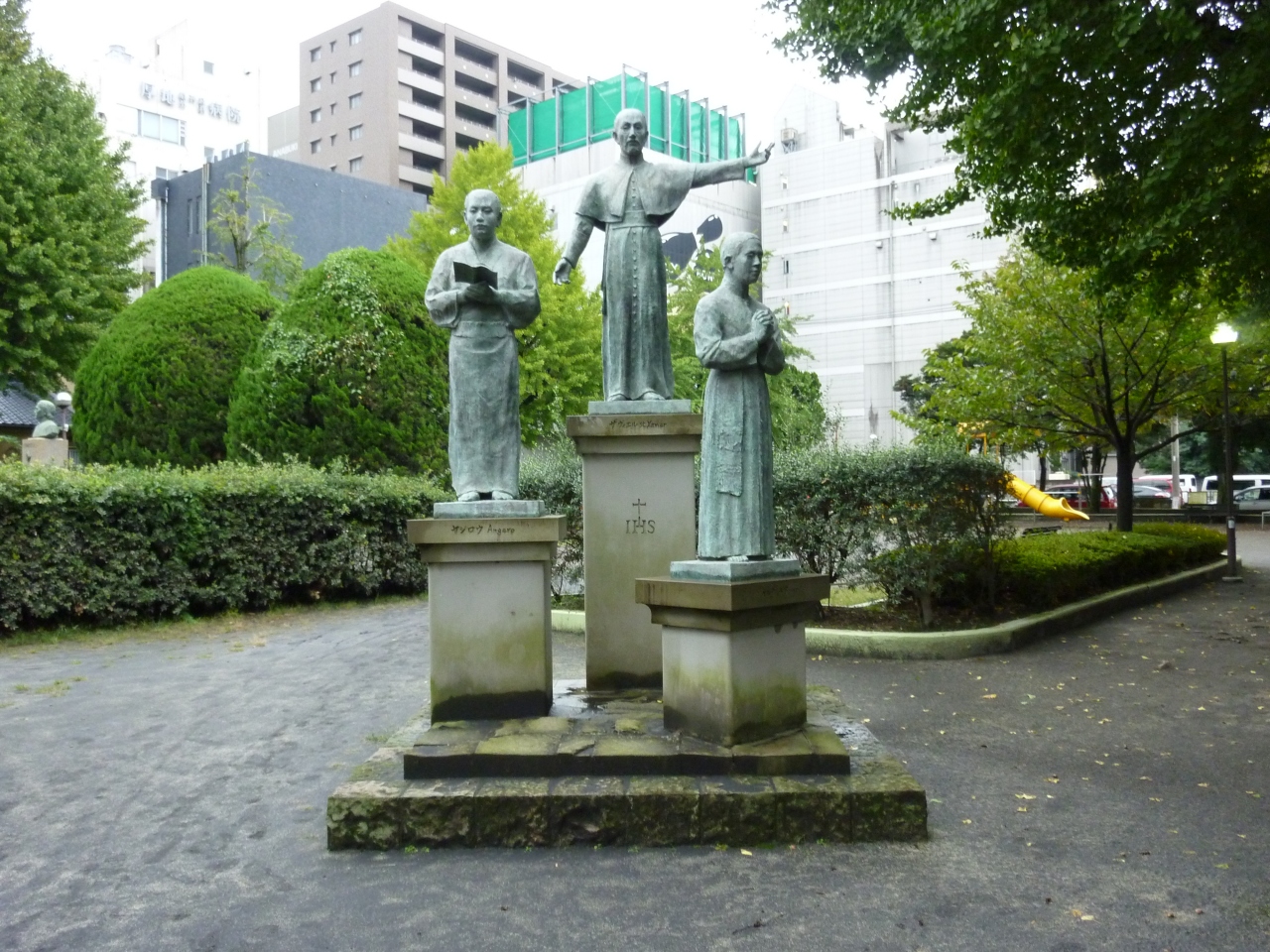 公園内には、写真の「ザビエルとその信者たちの像(?)」や「ザビエル滞鹿記念碑」があります。特に「ザビエル滞鹿記念碑」はなかなか見ごたえがある造りになっていました。
