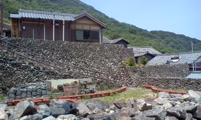 外泊漁港の一角に休憩所(しおかぜ)がここのおじいさんに石垣の里の事を色々聞き、狭い路地を上っていくと、小さい石を積み上げた石垣があちらこちら、これだけ狭いと家を建てる時も大変だったろう、上の方に憩いの場として利用できる(だんだん館)が有りここからの眺めもまずまず、生活用品は全て持って上がらねばならないから大変だろう、人も居ないのでのんびり。