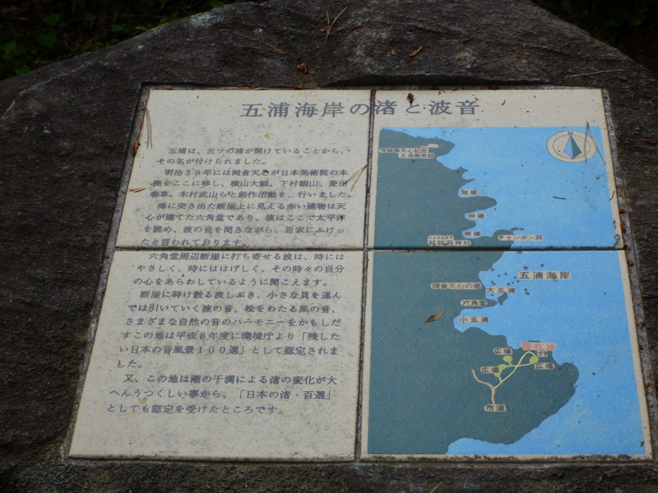 あたりは切り立った岬になっていますので、下には五浦海岸の海が、外には太平洋の荒波が見えます。