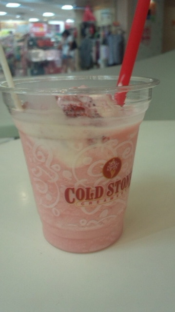 夏限定の、"クーリーズ・フルーツ・ジェラート"というのを頼んでみました。 フローズンのドリンクの上に、アイスがのっています。 フローズンドリンクはヨーグルト味にしたのですっぱいですが、とけてきたら、アイスを混ぜてマイルドな感じで飲めて美味しかったです。