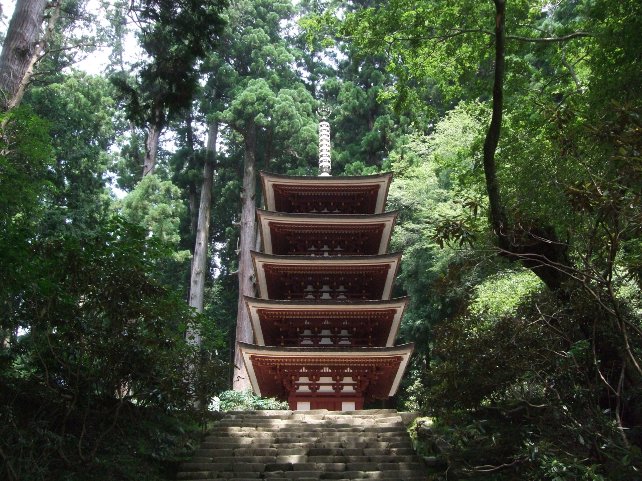 さて、これが日本に七つしかない国宝五重塔のひとつ、有名な室生寺の五重塔です。石段の下から眺めるこのアングルが一番美しいでしょう。この石段の両側には有名な石楠花。季節のころがいっそう賑わいます。塔の周囲を杉の大木がなにか宝物を包むようにそびえていますが、以前、台風でその杉が倒れてしまい、この五重塔が大きな損傷を受けてしまいました。今はすっかり元通りです。屋根の裏側の白い縁取りも上品で、女性的な繊細さを感じるのですが、いかがでしょうか。