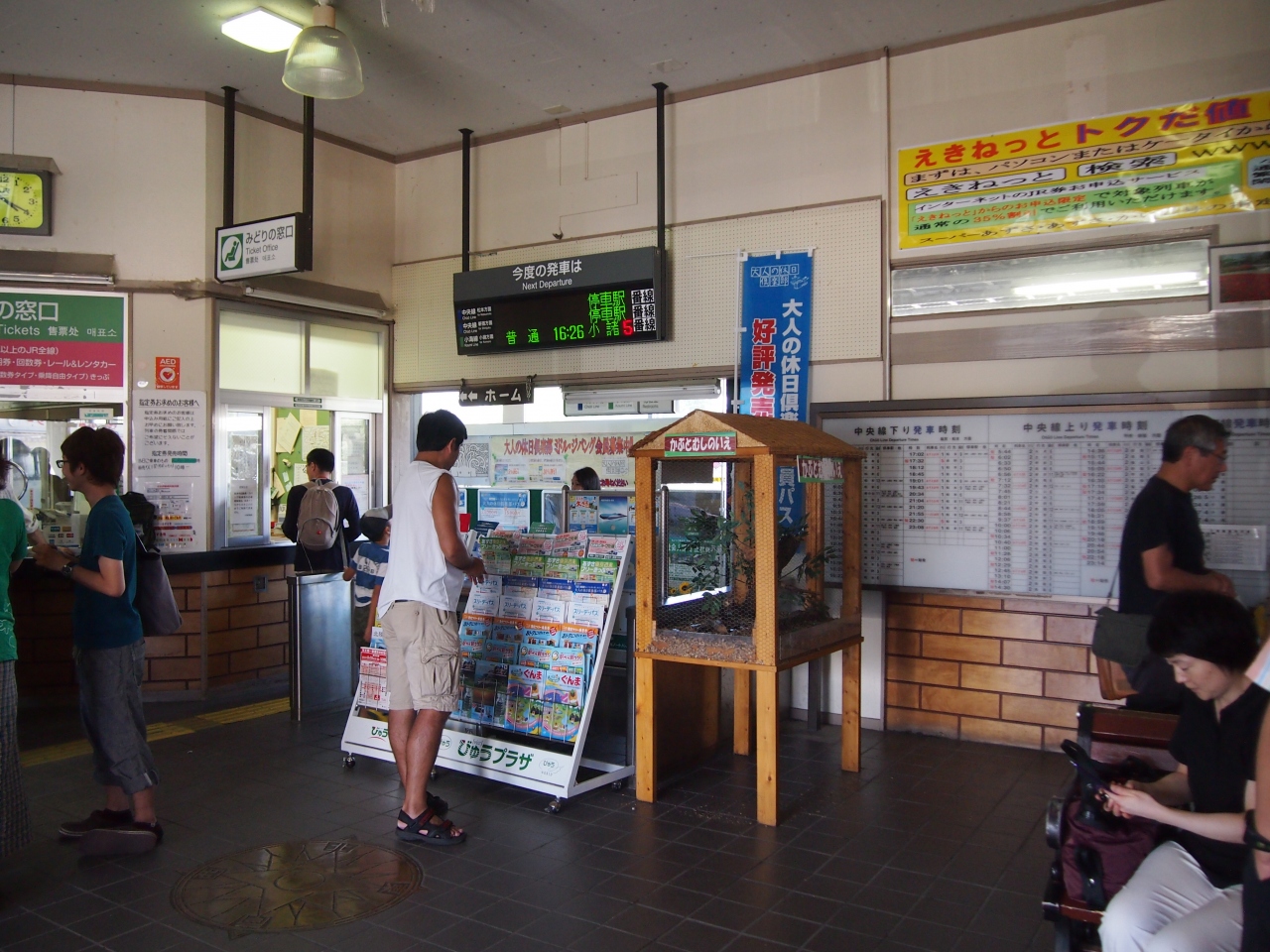 駅前には観光案内所や公衆トイレがあります(トイレは駅構内にもある)。 季節的なものだとは思いますが、駅の待合スペースには、"カブトムシの家"があり、何匹も飼われていました。 なかなか珍しい駅♪