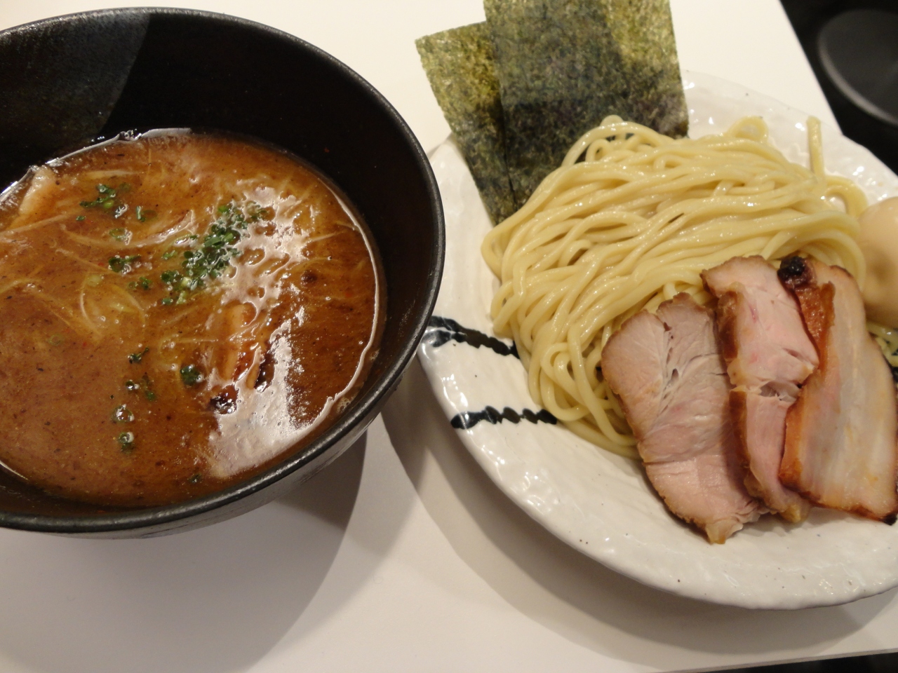 二人で「特製 濃厚豚骨魚介つけ麺(味噌)」1030円と「特製 濃厚豚骨魚介つけ麺(醤油)980円をそれぞれオーダー。途中で交換して食べ比べることにしました。