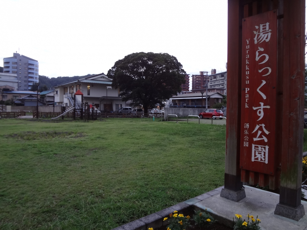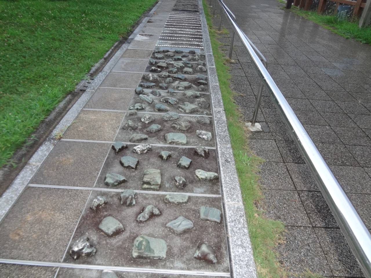 湯らっくす公園には、足湯や足つぼの刺激できる石の健康遊歩道などがあります。足湯はけっこう熱めの温度で、あまり長い時間はつけていられませんでしたが、足つぼを刺激した後には気持ちが良かったです。健康遊歩道は、いろんな形の石が埋まっている上を歩くようになっているのですが、私にはかなり刺激が強くて痛かったです。公園の真ん中には川が流れていて涼しげな感じもあり、広場もありました。足湯は無料で、ゆったりと足の疲れをいやすことができるお得なスポットだと思います。
