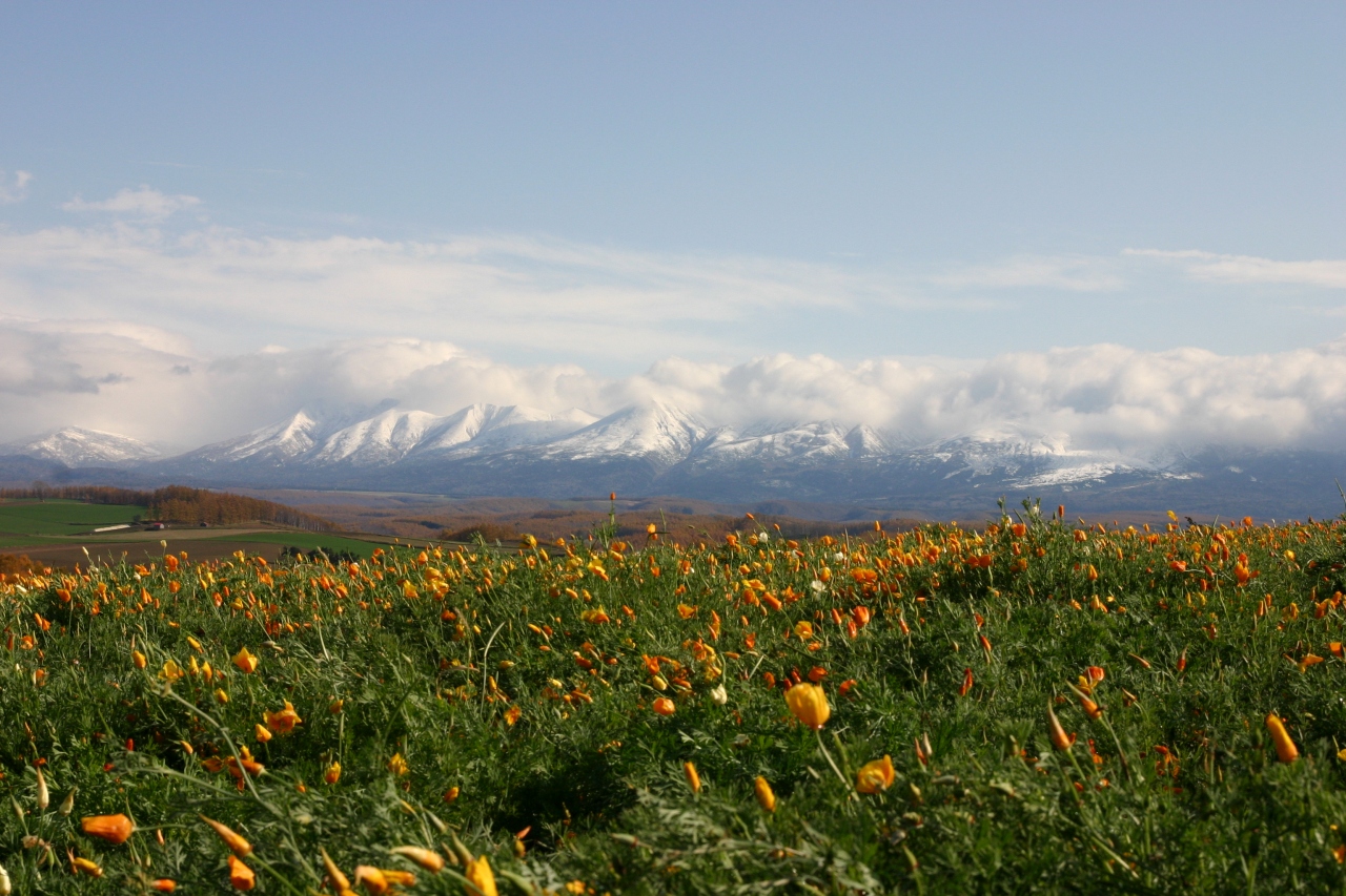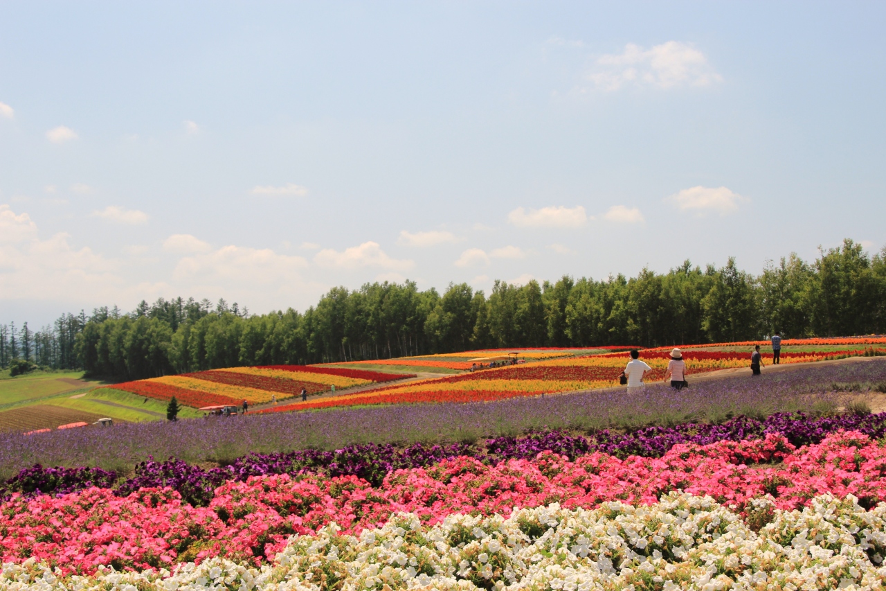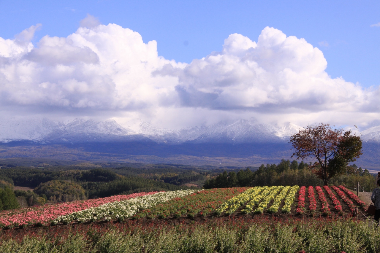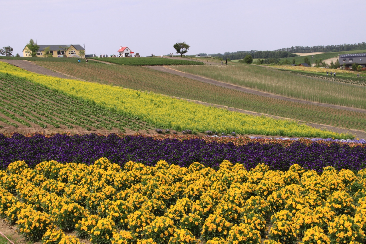 「丘のまち美瑛」を象徴するような丘陵地に色とりどりの花が植えられていて、北海道のツアーパンフレットに載っているような“うねった”お花畑が見られます。お天気が良ければ花畑の向こうに十勝連峰ものぞめ、絶景です。