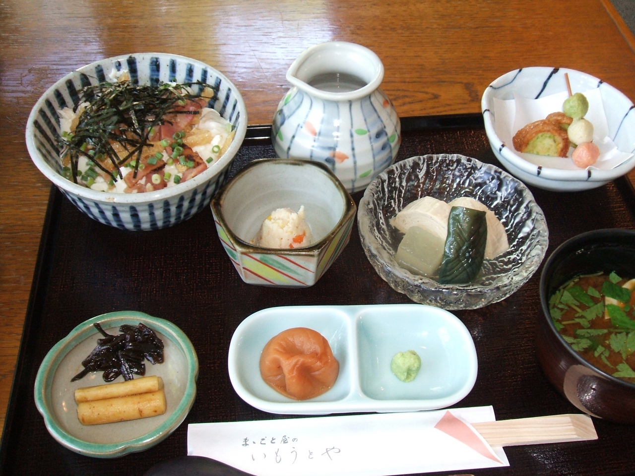 内容は道明寺蒸し、揚げ物、うの花煎り、香の物、味噌汁。