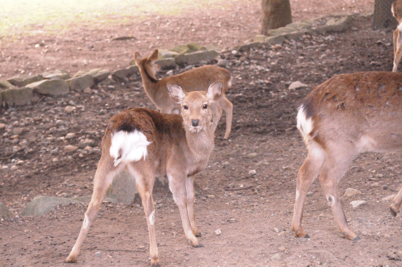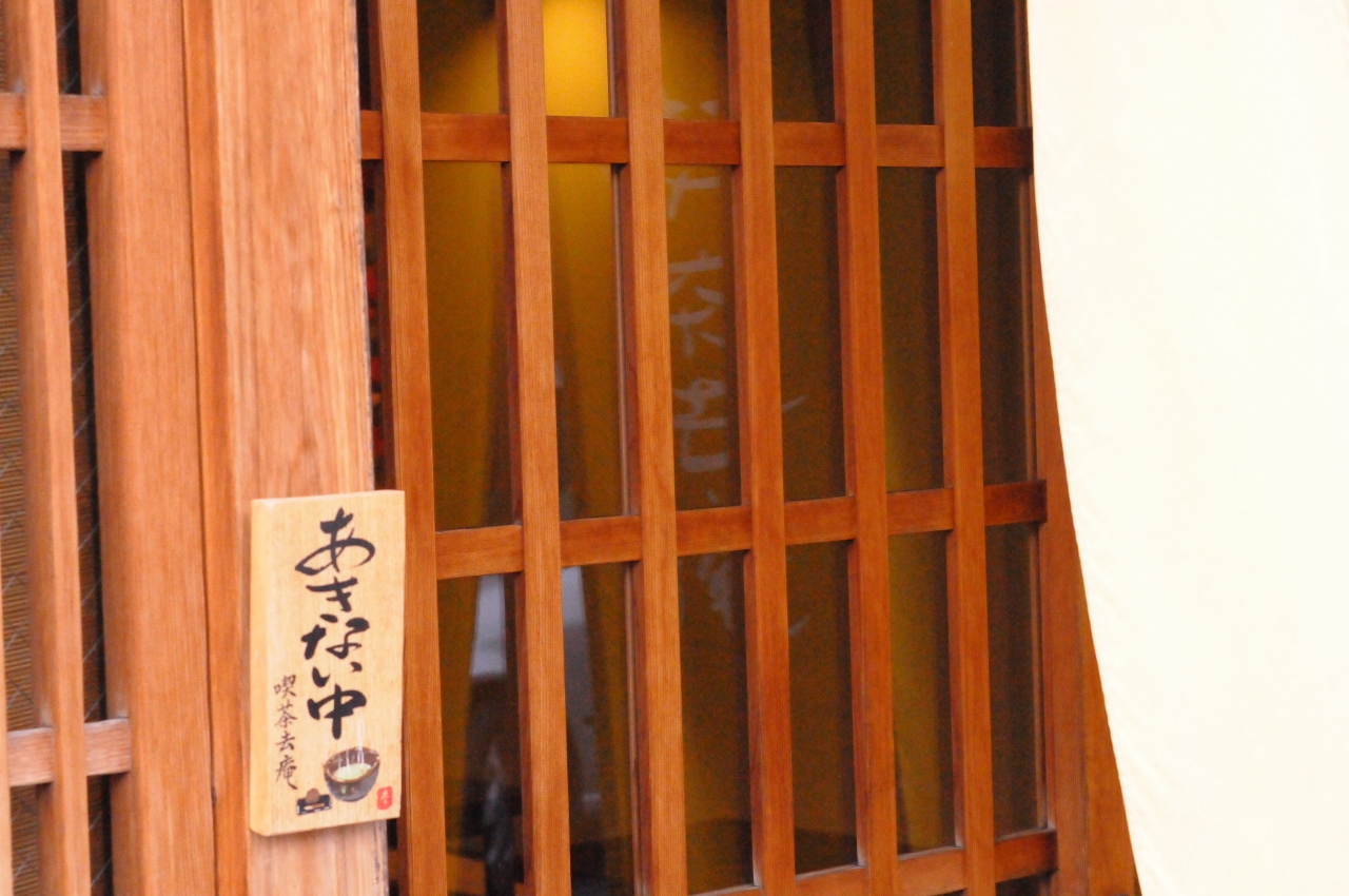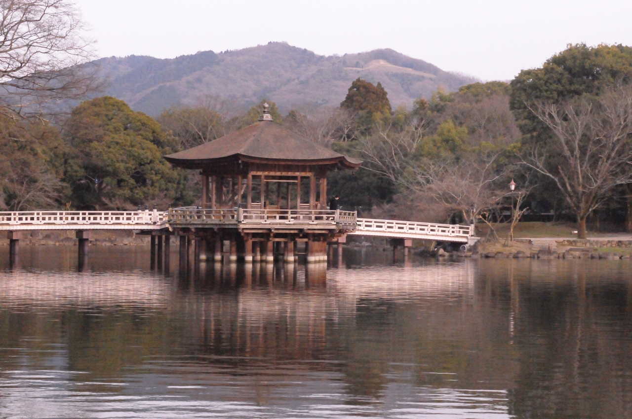 奈良駅から5重の塔までの土産物街を歩いて15分ほどで浮見堂へ出ました。奈良公園の鷺池に浮かぶ檜皮葺き(ひわだぶき)、八角堂形式(六角形)のお堂です。この辺りは 写真を撮るスポットで三脚を立てているカメラマンたちが見られました。わたしたちもその中にまぎれ、夕暮れ時のお堂を撮ることができました。そこから「ならまち」のほうへ散策。そこは旧市街地の南側の古い民家を再生してカフェやショップに改装し、観光の名所として有名です。