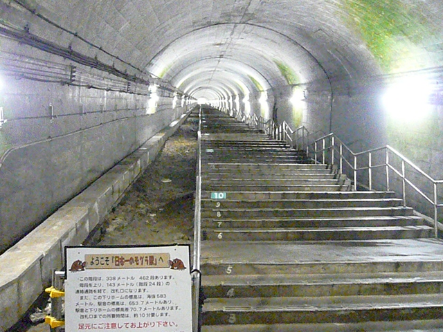 山小屋のような駅舎。上りホームは地上だが、下りホームは延々と続く階段を使わないと到着しない。もぐらホームはひんやりとしていて一瞬涼しげだが、改札に向かう階段を登っているうちに汗だく。見学の為に来ていた年配の方が階段を下りるのを躊躇している姿も。そのくらいゴールが先に見える階段です。一度行けば十分ですが、逆に一度は行ってみて良い場所だと思いました。