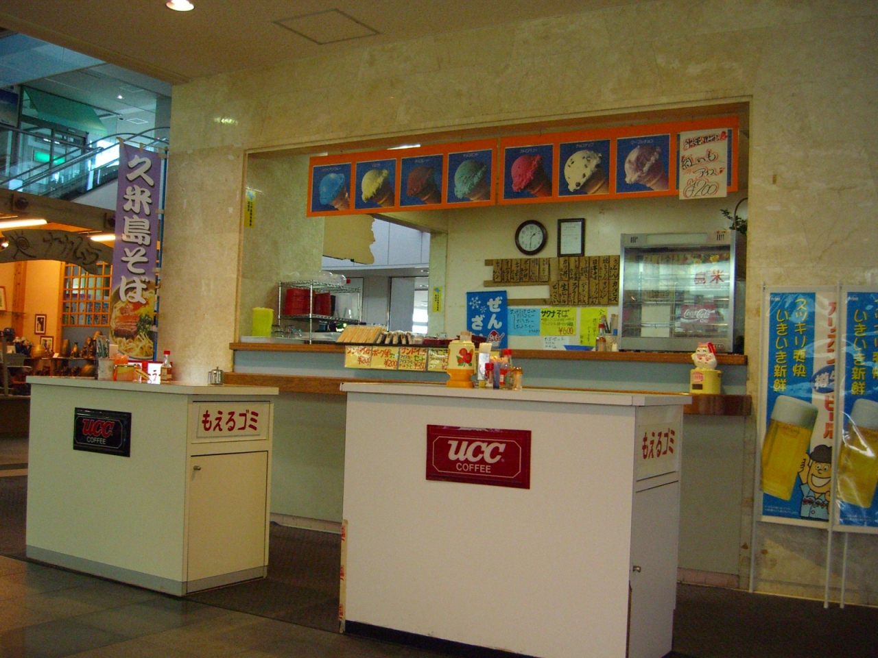 那覇空港から久米島空港に降り立つとレンタカーやホテルの迎えが多くいました。飛行機が離発着していないときは閑散としています。土産屋は5店舗ぐらいあったと思います。立食コーナーもあり、帰り那覇に向かう前に久米島そばとアイスを食べました。