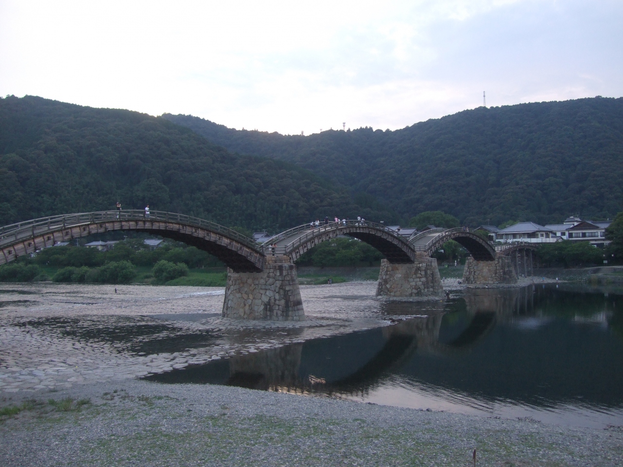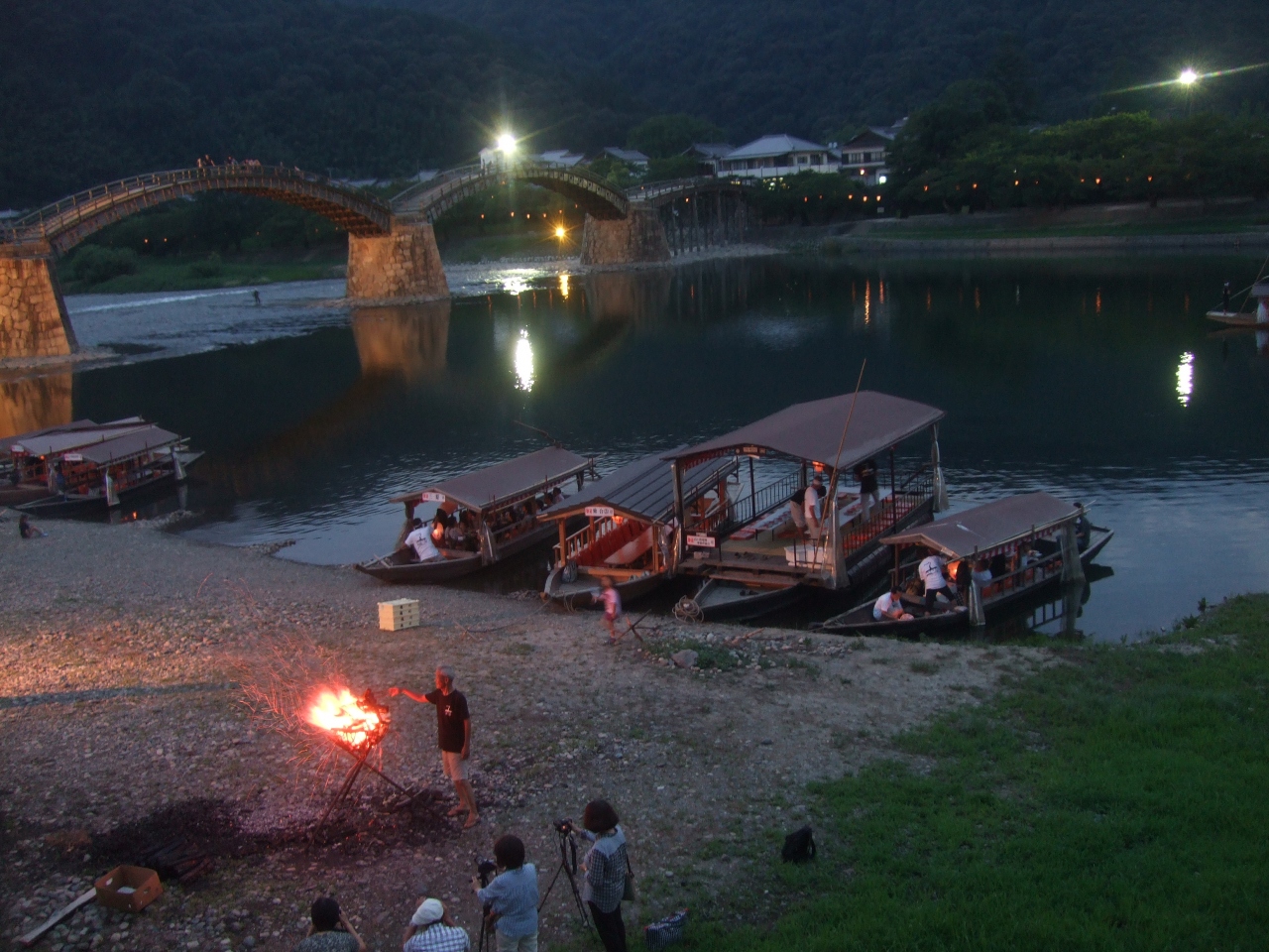 錦帯橋の眺めは素晴らしです。また暑い日だったのですが橋の下の川で水につかってのんびりと休むことができました。錦帯橋の入場料?は300円(往復分)かかります。これは錦帯橋を維持するための経費なのですが、夜はスタッフがいなくなり、回収Boxが置いてあるだけですので、後は個人のモラルで払うことになります(夏であれば19時以降にスタッフがいなくなります)。8月18日に行ったのですが、この日は20時から鵜飼を見ることができたのですが..時間がなかったので見ずに帰ったのが少し残念でした。ちなみに錦帯橋の側にはいくつかお食事処があるのですが、19時くらいにはほとんど閉まっており食事が取れそうなところは近くのホテルくらいでした。