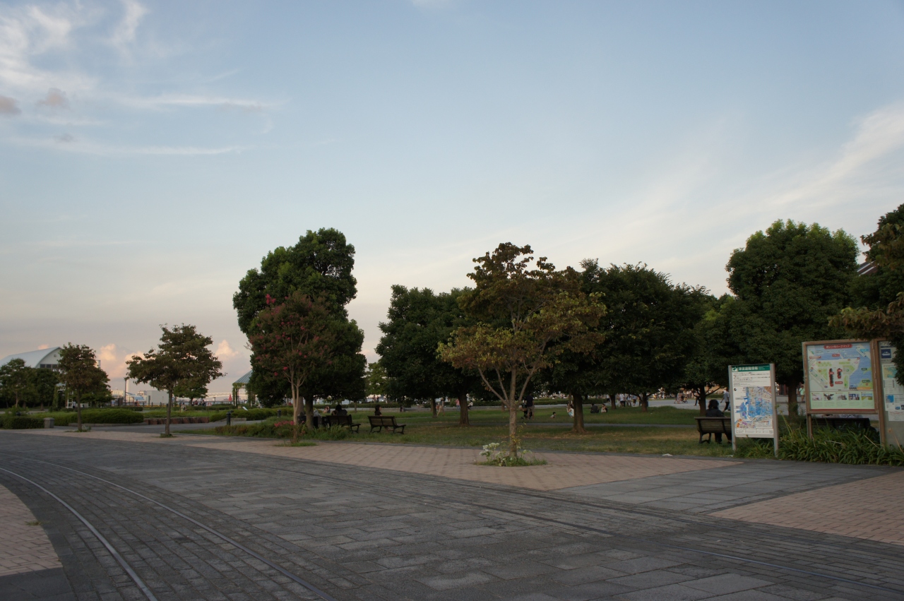 公園には、旧横浜港駅プラットホームが復元・保存されています。屋根は新しいものですが、軌道跡も残っています。
