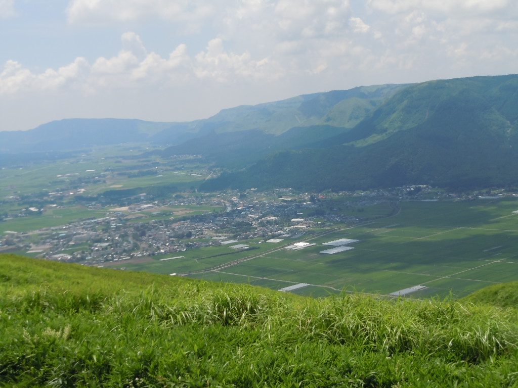 展望台からは緑の山々を望むことができ、下を見ると田んぼが綺麗に敷き詰められたような景色を見ることができます。暑かったけど風も気持ちよかったです。展望台へは駐車場から10分ほど歩いて登ります。駐車場前にはお土産品店があり、阿蘇の搾りたて牛乳やソフトクリーム、からし蓮根を揚げていたりとついつい食べ過ぎてしまいます。観光バスやバイク集団がたくさんいました。
