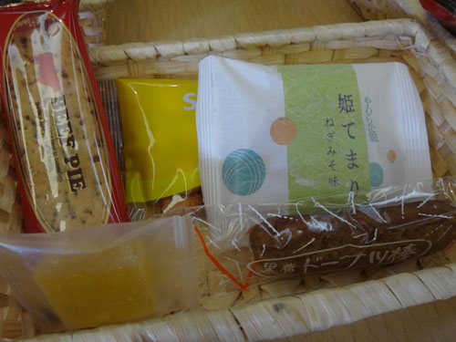おつまみは工場技師長お勧めのパインジュレやネギ味噌煎餅など。