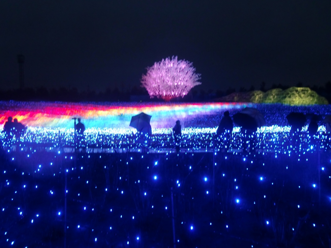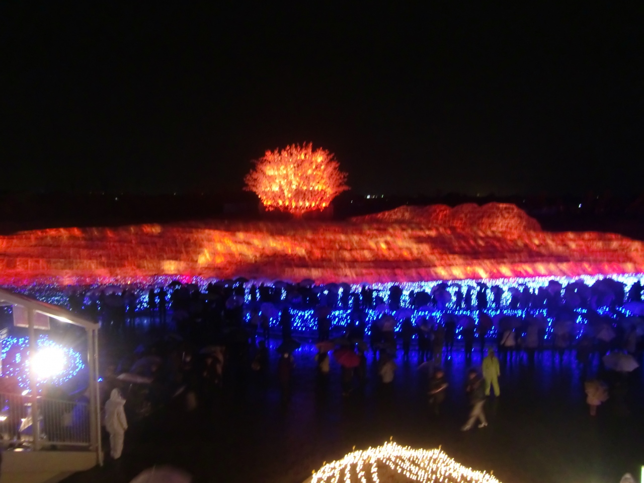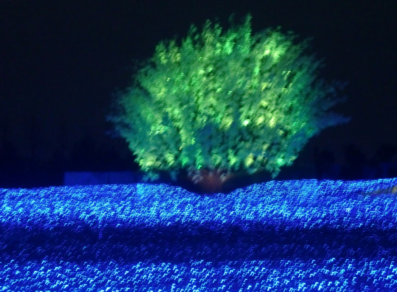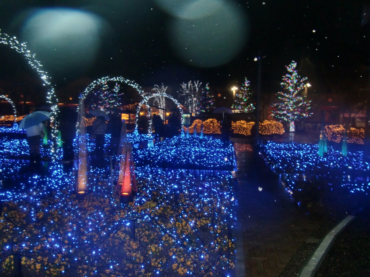 四季折々に季節の花を敷地内の大花壇で楽しめるお花畑やベゴニアやバラの大温室で有名なテーマパークです。ここは冬になると花壇の花が少なくなったり、日が落ちるのが時期的に早くなる事を逆に旨く利用したイベントを毎年やっています。ウインターイルミネーションと言って毎年何らかのテーマを元に全体で約300万級ものLED電球を使って一大イルミネーションが行われています。ちなみに行った時は四季がテーマでした。大花壇のある方の会場は雨にもかかわらず凄い人が押し寄せていてゆっくり堪能していい写真を撮るのは不可能に近かったですが、春から冬の移ろいを一本の木と回りを囲む草原に御岳様々な四季の色でムード溢れる音楽と共に見せてくれました。