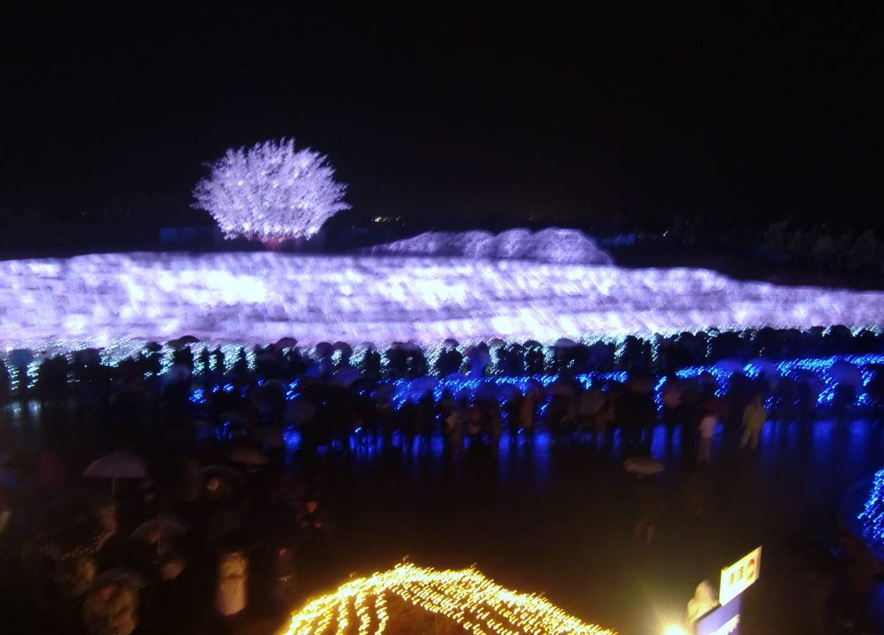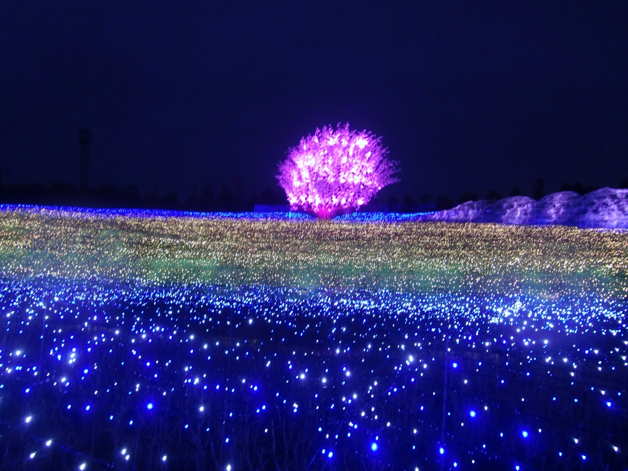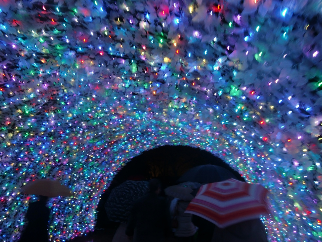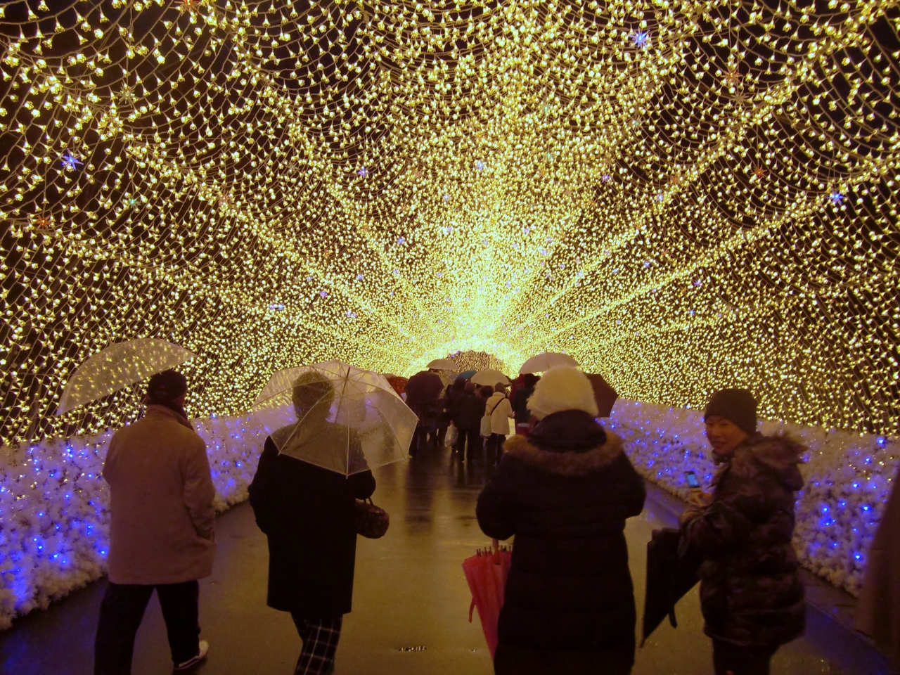 四季折々に季節の花を敷地内の大花壇で楽しめるお花畑やベゴニアやバラの大温室で有名なテーマパークです。ここは冬になると花壇の花が少なくなったり、日が落ちるのが時期的に早くなる事を逆に旨く利用したイベントを毎年やっています。ウインターイルミネーションと言って毎年何らかのテーマを元に全体で約300万級ものLED電球を使って一大イルミネーションが行われています。ちなみに行った時は四季がテーマでした。大花壇のある方の会場は雨にもかかわらず凄い人が押し寄せていてゆっくり堪能していい写真を撮るのは不可能に近かったですが、春から冬の移ろいを一本の木と回りを囲む草原に御岳様々な四季の色でムード溢れる音楽と共に見せてくれました。