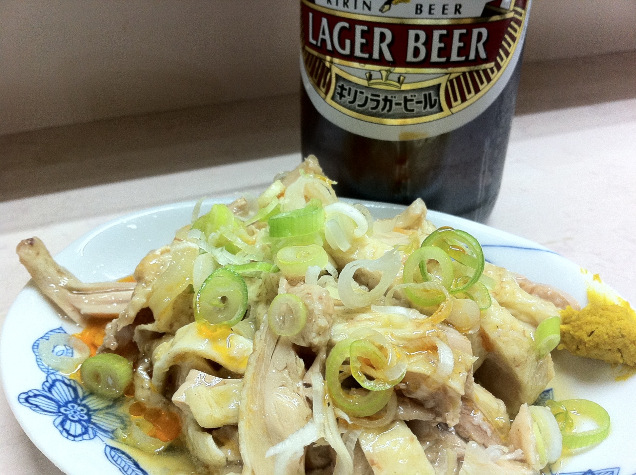 鶏のもも肉を蒸したものに、塩だれ、ごま油、ネギがのせてあります。