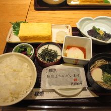 朝定食を頂きました。 卵焼きに小鉢(ナスの煮びたし)、とろろ小鉢、ミニお蕎麦で980円(だったと思う)全体的に濃い味ではなくってとても美味しかった。店員さんもオバチャマ達が頑張っていて良かったと思う。禁煙エリアと喫煙エリアが分かれているけど正直臭いよね。愛煙家の方は可哀想だけど、いまどきどうかな?と思いました