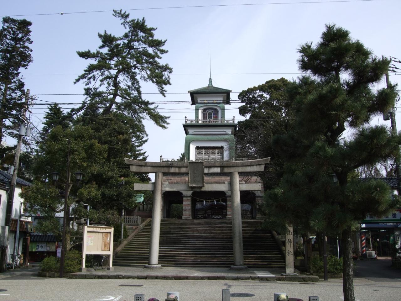 尾山神社は、加賀藩の藩祖前田利家をお祭りして創建された卯辰八幡宮が始まり。明治に入ってから現在地に移され、尾山神社となりました。市内中心の香林坊にもほど近く、大通りにも面していますので、金沢観光の知識がなくても、必ず気がつく場所だと思います。写真の神門は、和洋中の三様式が取り入れられたもの。上部の五色のギヤマンが特徴的ですが、夜になると、灯がともされてロマンチックに光ります。境内には、前田利家の像もありまして、ホロを背負い信長に仕えたころ、若き日の姿です。その奥には神苑もありますので、時間があればどうぞ。