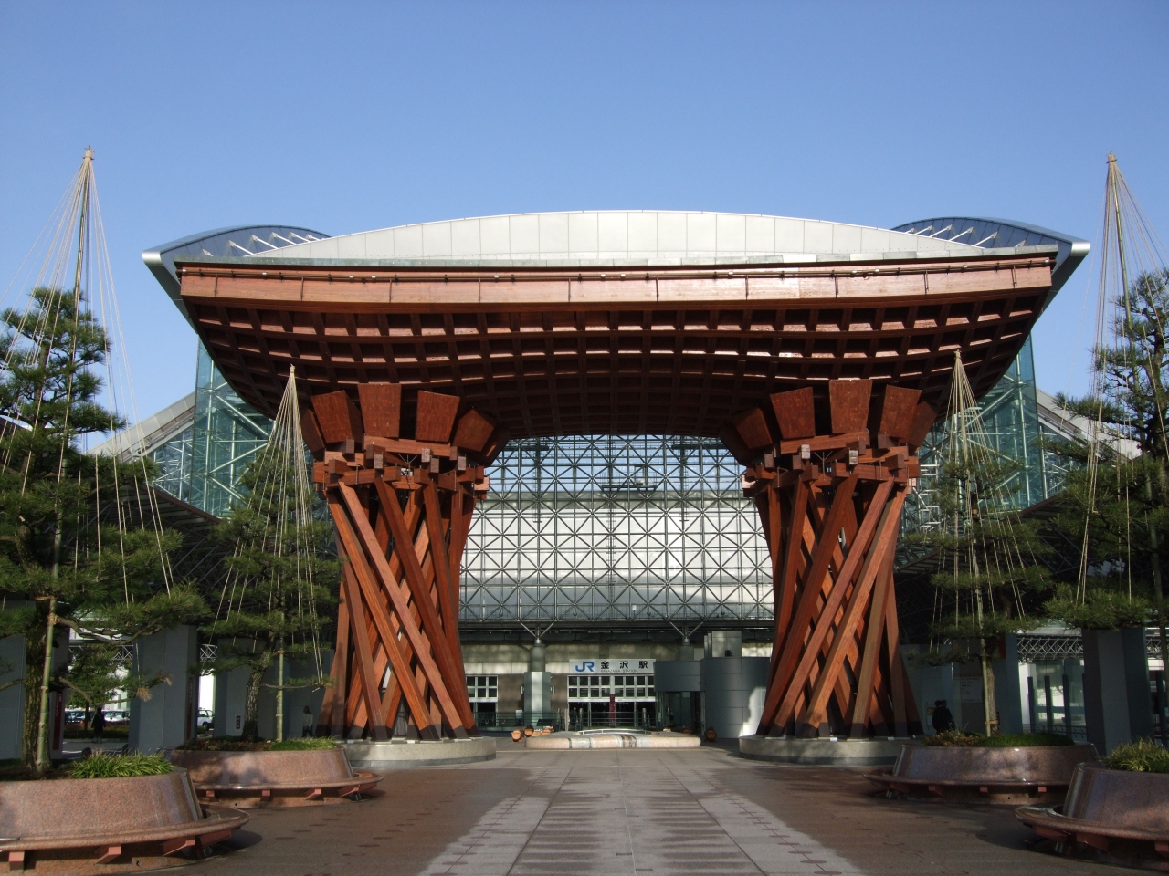 金沢駅は、金沢市の玄関。市内中心部に向かって立つこの鼓門は、能楽の一派「加賀宝生」をモチーフとしてデザインされた、木製の巨大建築。伝統文化を育んできた金沢の街のシンボルとしては、これ以上のものはないくらい。アルミ合金とガラスを素材とした駅舎「ガラスドーム」とのコントラストも素晴らしいですね。さて、ここから、中心地香林坊へは歩いてもいけないことはないのですが、やはりバスでしょうか。歩くとすれば、駅前の大通りに面した九谷焼のお店がお勧め。それから、金沢の台所、近江町市場に立ち寄ったり、尾山神社を眺めたり。街のスケールを感じながら、歩けます。