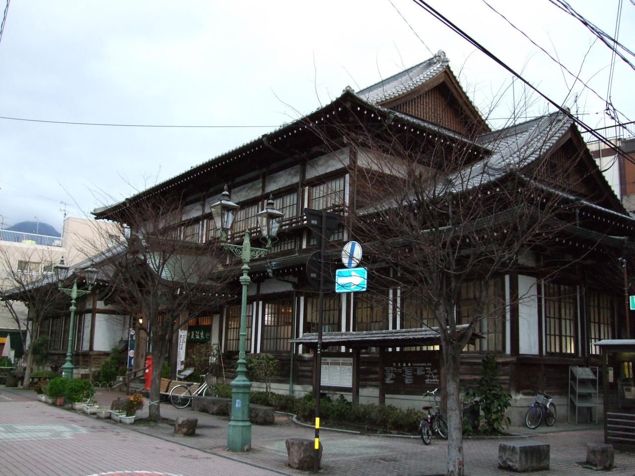 竹瓦温泉は、別府駅から歩いて20分くらい。現在の建物は昭和13年に建てられたもの。正面の唐破風造りなど豪華な中にも、建物全体の雰囲気が別府の長い歴史を表わしているような渋さがあります。中に入ると、板間は黒光り。一角に小上がりがあって、そこで寝っ転がれます。浴場は、地下に降りるような感じ。脱衣場に隔てはなくて、脱いだらそのまま一階分下にある風呂を見下ろして、階段を下りていきます。砂湯もあります。ただ、周囲はどっちから行っても風俗街。家族連れにはちょっと違和感があるかもしれません。