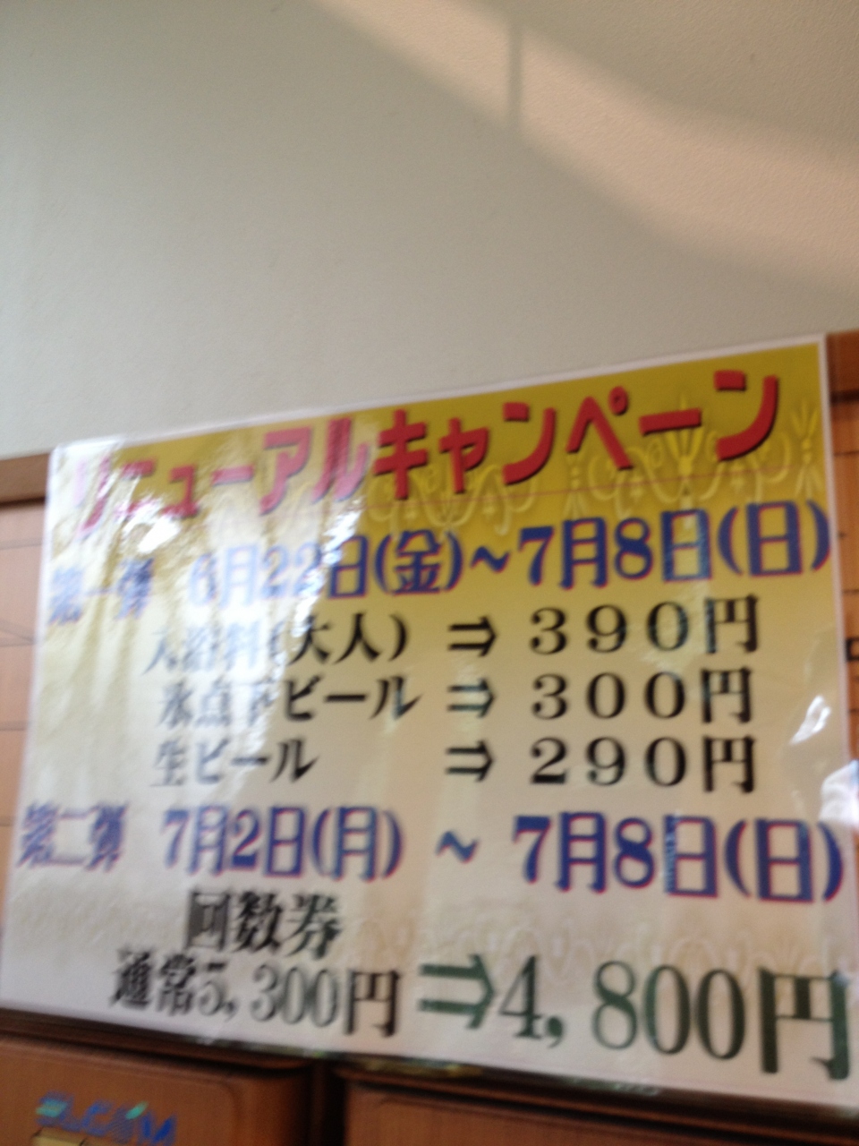 おふろの王様 (光が丘店)では、すでに、終了してしまいましたが、リニューアルキャンペーンにて入浴料が大人390円と割安となっていて、また、生ビールも290円となっていてサラリーマンには易しい企画です。ぜひ、調べてみてください。