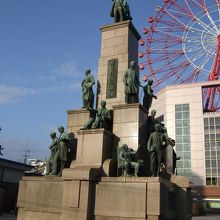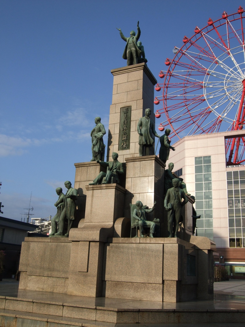 「若き薩摩の群像」は、鹿児島市の玄関鹿児島中央駅の前広場の一角にあります。といっても、駅への進入道路の脇なのでちょっと分かりにくいかも。私も少し探すのに、時間がかかりました。群像の青年は、江戸時代の末期に国禁を犯して海外留学を果たし、日本の近代化のために尽力した薩摩藩の青年藩士17人。昭和57年に建てられました。主な顔ぶれで知られて人物と言えば、引率者では五代友厚、学生では、初代文相の森有礼でしょうか。これも、薩摩の明治維新への貢献を示す記念碑ですね。