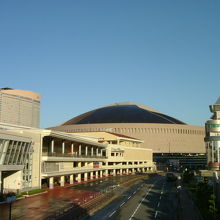福岡ドームは、福岡ソフトバンクホークスの本拠地。福岡市の西寄り、海岸に面して埋め立てられた「シーサイドももち地区」にありまして、地下鉄の最寄駅は唐人町駅なのですが、歩いて15分くらい。正直、けっこう遠いです。ダイエーがこれを造った時に、高層リゾートホテル(旧シーホークホテル&リゾート)と総合商業施設・ホークスタウンを合わせて、三点セットとしていましたが、それぞれ今は、別のオーナーになってしまいました。球場としては、がっちりした印象のデザイン。中に入って客席から眺めると、鍋の底をのぞくようで、サッカースタジアムに近い感じを受けました。