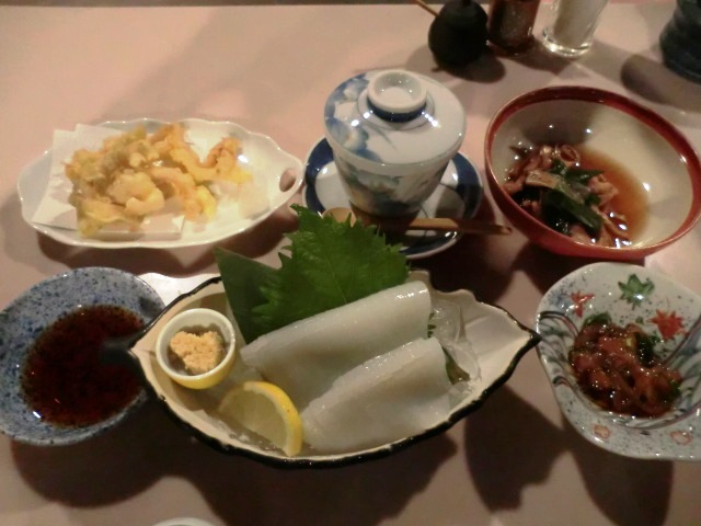 鳥取名物である白いか御膳を注文しました。画像は、刺身、沖漬け、てんぷら、下足とネギの煮物、茶碗蒸し、ご飯、お味噌汁、オレンジでした。白いかをしょうがで食べるのは初めてでしたが、甘さが引き立って最高でした。おかずがビールのつまみにもなり一石二鳥で満足しました。
