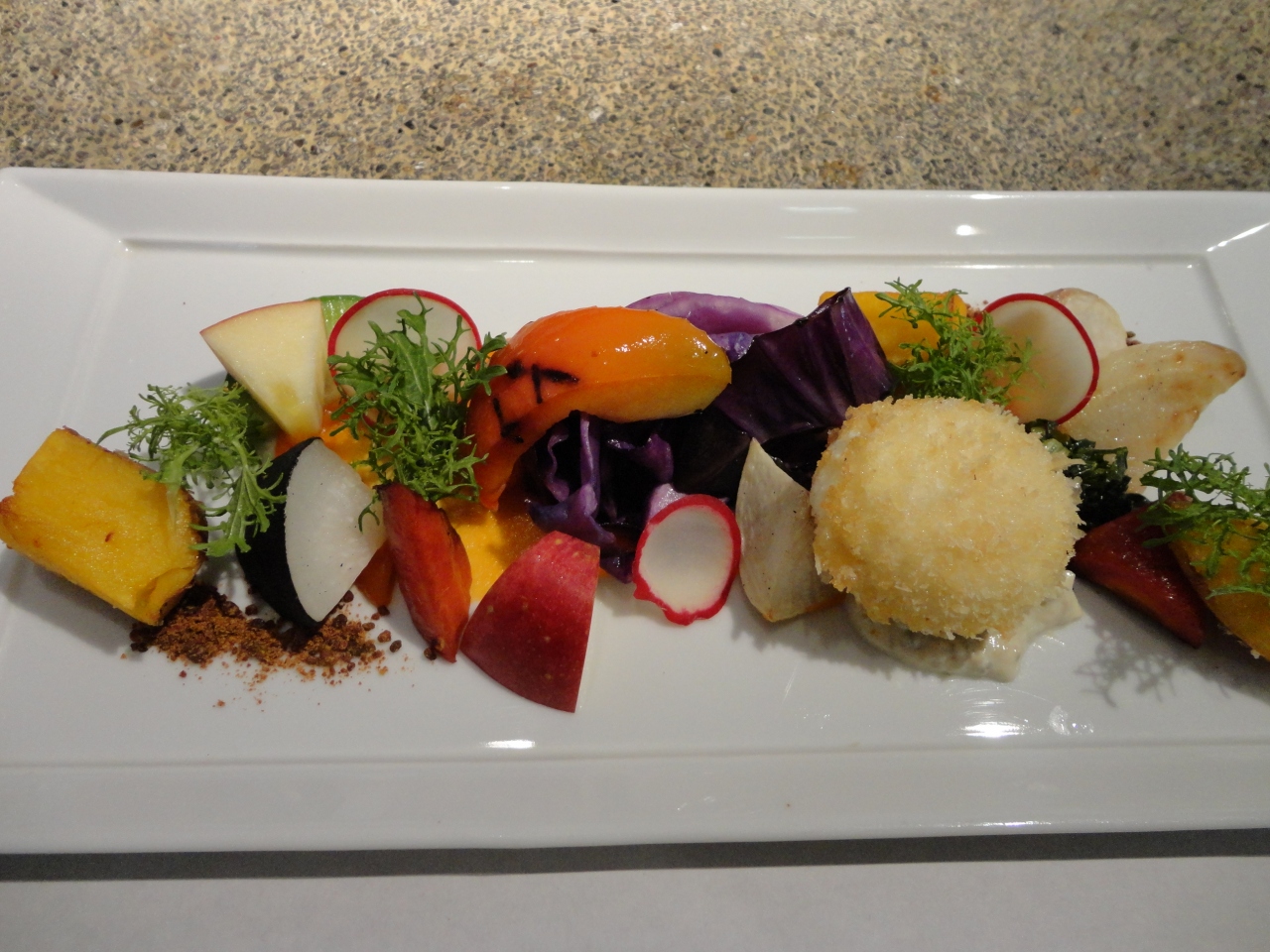 野菜だけでなく、ポーチドエッグのフライや、豆腐シーザーサラダ風タルタルソース、味噌を粉末にしたスパイスなども添えられていて、それらをあわせることにより、幾重にも味わいが広がり、大変食べ応えのある一皿です。