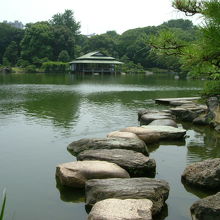 清澄庭園は、地下鉄清澄白河駅からすぐの都立庭園。元は、紀伊国屋文左衛門の屋敷跡らしいのですが、明治期に岩崎弥太郎がこれを買い取り、池泉回遊式の庭園に作り上げました。圧巻は、全国から集めたという名石。写真は磯渡りと名づけられた一角ですが、池の淵に飛び石が配置されています。入り口に近い側にも、大渡りと称して、もう少し大きな石の渡りがあります。遠くに見えるのは涼亭。静かな趣があって、豪壮さと対比を成しているような。池には水鳥も多くて、えさをやったりしている家族連れもいました。
