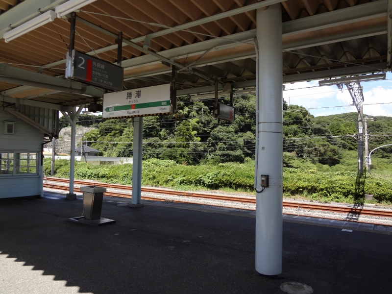 港町勝浦の玄関口です。駅は近代的な橋上駅で雰囲気はあまりありません。駅前にはお土産屋が1件。あるほかは、商店や住宅が並んでいます。勝浦担担麺や寿司など、ここで食べられるご飯は美味しいものが多いのでお勧めです。南口のバスターミナルからは御宿や大多喜方面への路線バスや、東京への高速バスが出ています。