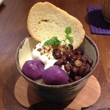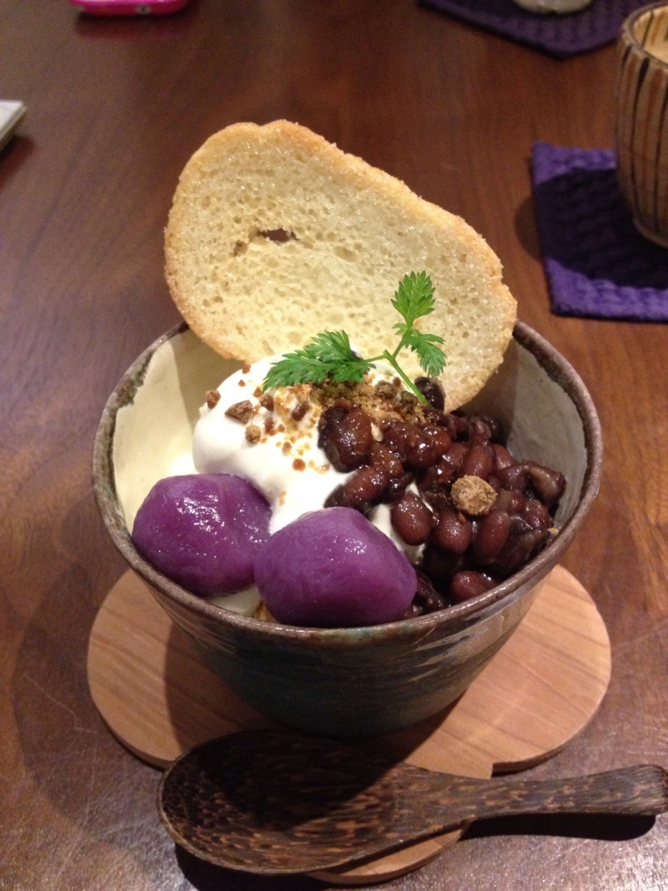 夕ご飯もそこで食べようと思っていたのでまずはお茶をすることに。宮古あずきパフェを頼んだら紫いもで作られたらしき白玉が入っていて美味しかった。友人の季節の果物パフェは特別季節を感じられるような果物ではなく???マークでした。