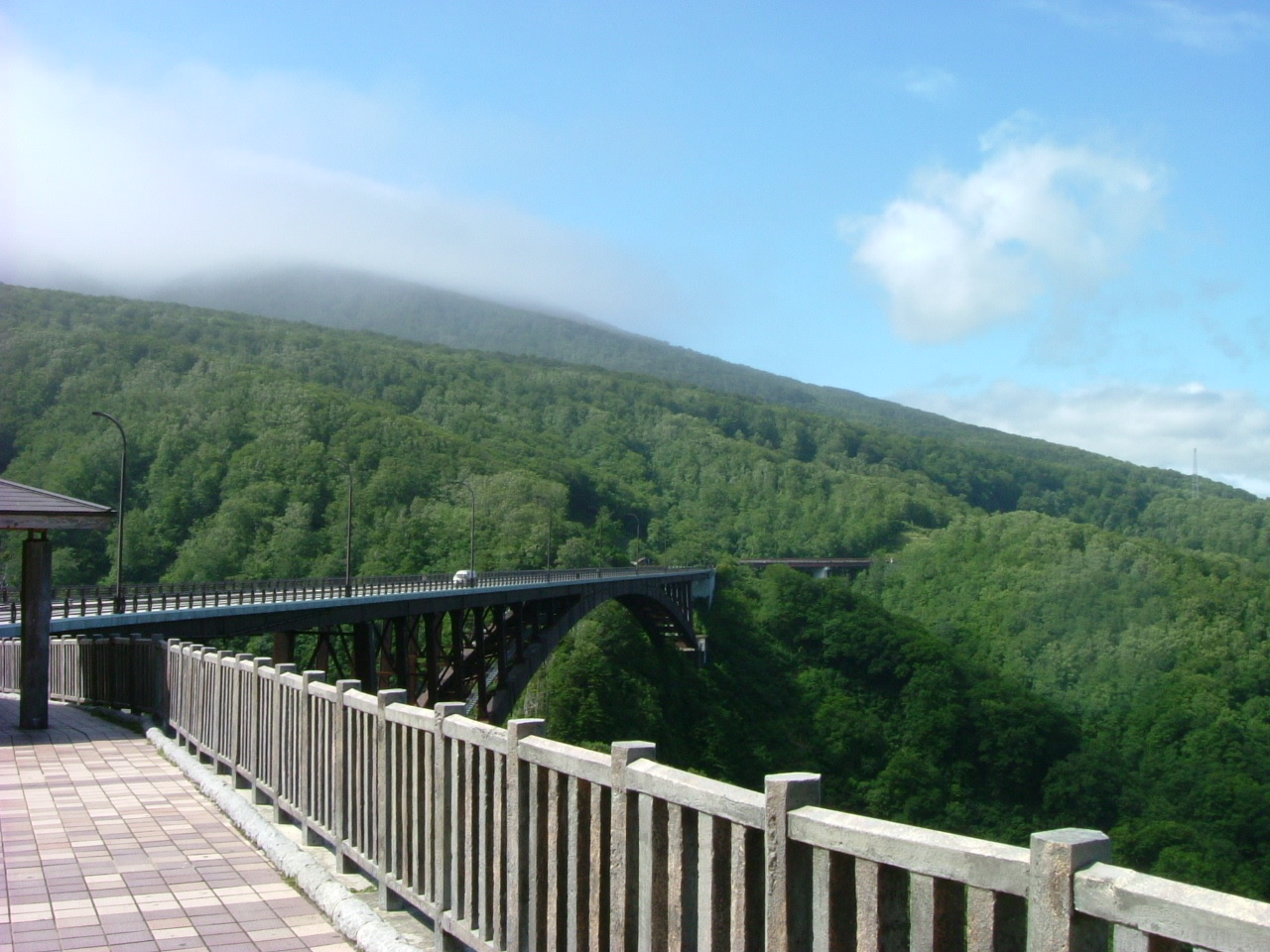 城ヶ倉大橋は、八甲田山にある橋。黒石に向かう国道の途中です。柱状節理の断崖に囲まれた城ケ倉渓流にかかっていて、長さ360m。谷底からの高さは122mあるようですが、いずれにしても、城ケ倉渓谷や八甲田の山々などが一望できる絶景が見事です。写真を撮ったのは、駐車場。やはり、ここで絶景を眺めながら休憩する観光客は多いようで、十分な広さもあるし、公衆トイレもあります。ただ、八甲田山の天気は変わりやすい。この後、左手から霧のような雲がどんどん降りてきて、一気に曇ってしましました。